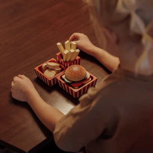 The set features a realistic wooden burger, a juicy piece of chicken, and crispy French fries, all neatly packaged in three red and white striped containers for added fun and authenticity. Children can create their own custom burgers, serve up crispy fries, and even swap ingredients for a new creation every time they play.