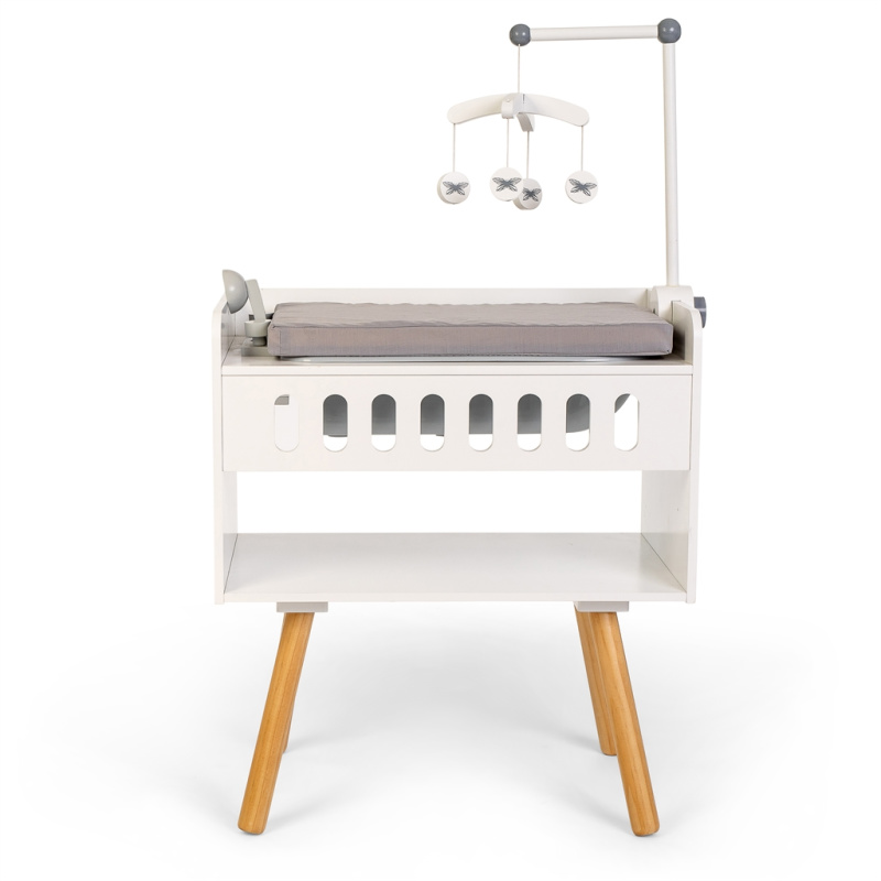 while he or she lies, looking up at the cute mobile. The shelf under the changing table can be used for clothes, nappies, towels or a pair of nice shoes.