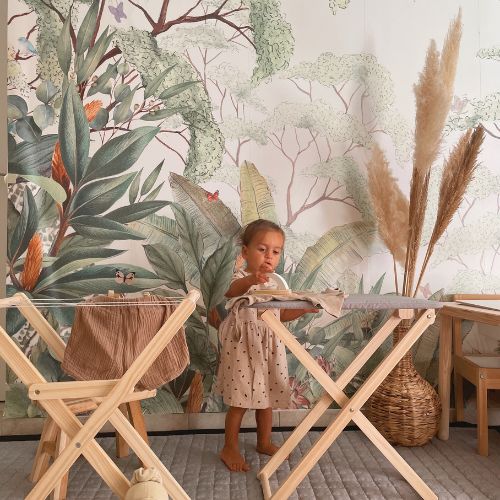 The surface of the ironing board is covered in grey cloth and the iron has a knob that makes a click sound. Wash the clothes in a washing column, dry them on the drying rack and iron them on the ironing board – all the products are part of our MAMAMEMO® range.
