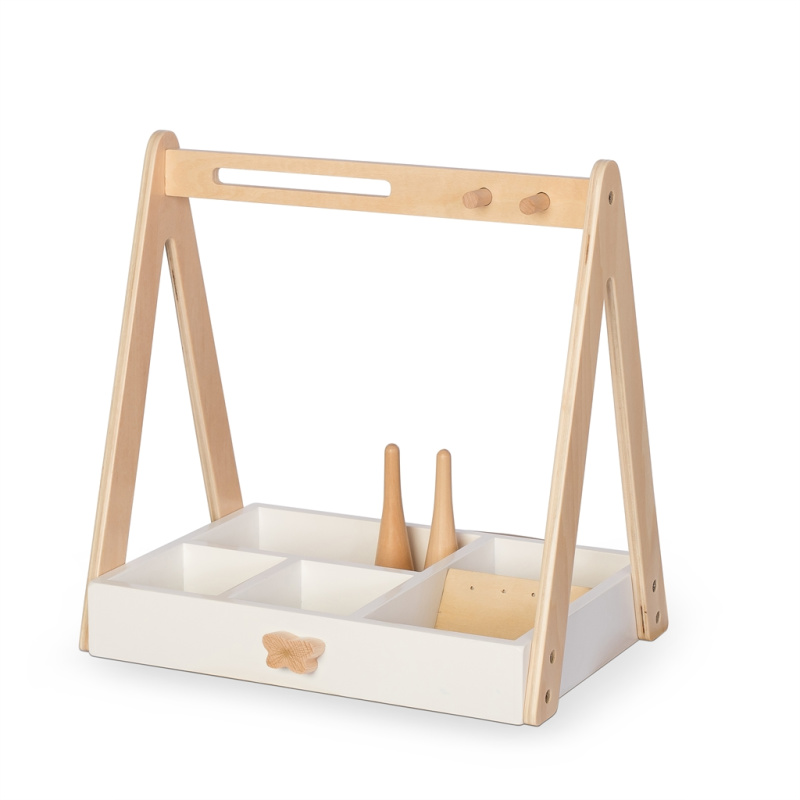 The jewellery stand features numerous great storage solutions, including little compartments for elastic bands, hair clips or bracelets, ring holders, small panels with little holes for earrings, hooks for necklaces etc.