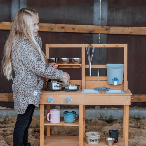 Equipped with a functional water container that can be opened for easy filling and two bowls underneath for mixing, children will have everything they need for mud pies, pretend meals, and plenty of hands-on play. The adjustable stove handles add an extra layer of realism, letting children feel like a true chef while learning to interact with their environment.