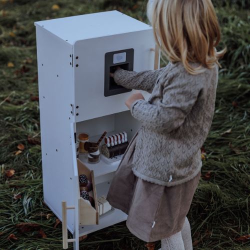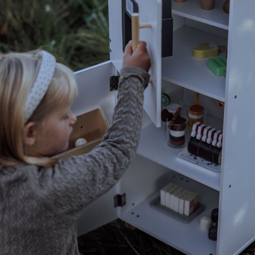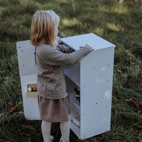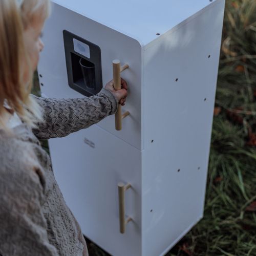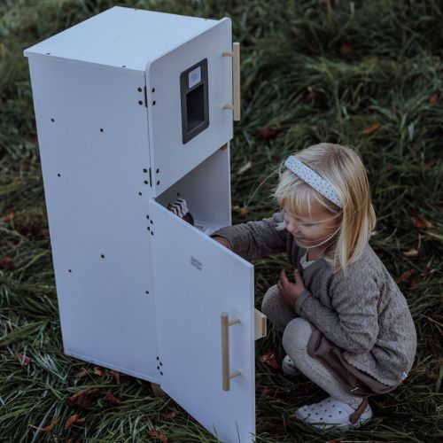 With its timeless white design and sturdy legs, the play refrigerator is an indispensable part of any child’s kitchen play. The refrigerator perfectly matches the play kitchen, and together they create the most impressive play environment.