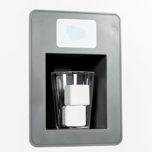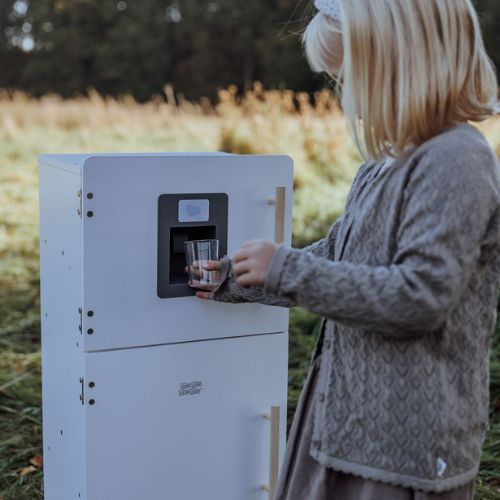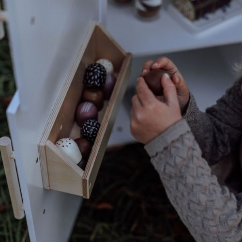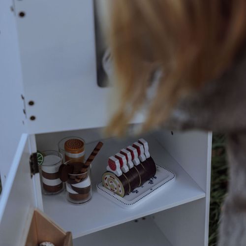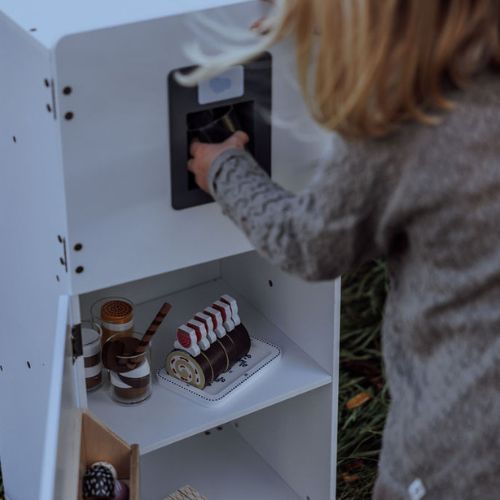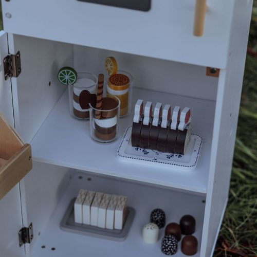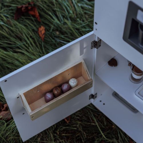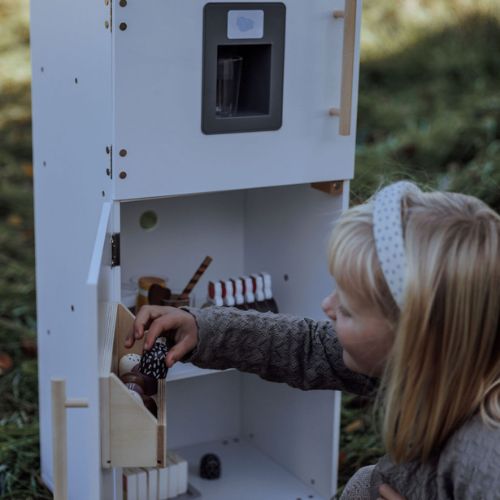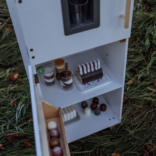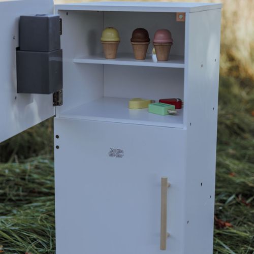 With two separate compartments behind each door, the refrigerator offers plenty of space for play food and drinks. Behind the lower door, you’ll find a spacious shelf and an extra shelf on the door, providing optimal storage space. Open the upper door to reveal a separate compartment with a narrow shelf. In the door, there is a smart ice dispenser that delivers wooden ice cubes with a push, just like in a real refrigerator.