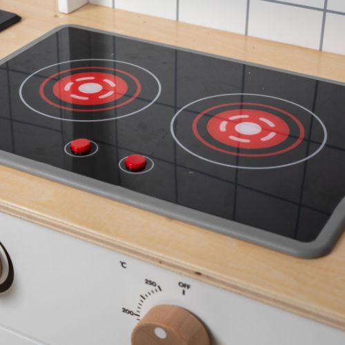 The play kitchen is made from FSC wood, which not only ensures a beautiful and durable construction, but also an environmentally responsible choice. Two adjustable dials invite hours of interactive fun – with a satisfying click sound at each adjustment. When the children turn the knobs, the magic begins: the hob lights up, accompanied by realistic “boiling” sounds, and the faucet emits a pleasant sound of water flowing.