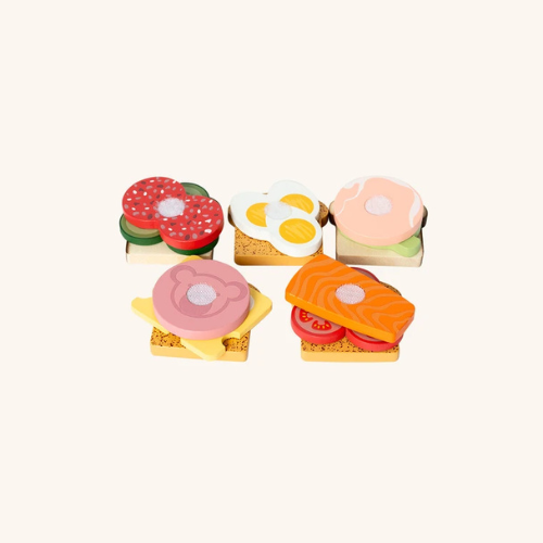 Unleash creativity and fun with this high-quality wooden play mix and match sandwich set. Crafted from durable FSC wood, this charming set allows children to create endless sandwich combinations by mixing and matching a variety of ingredients. From fresh veggies to tasty spreads, this set has everything young chefs need to build their perfect sandwich.