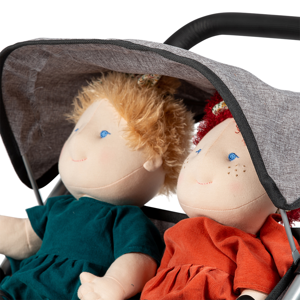 Your doll and teddy bear both want to go for a walk – but which one to choose? The MAMAMEMO® Dolls twin buggy means you don’t have to choose. There is room for both of them. There are even two harnesses so they can be strapped in for the whole walk.