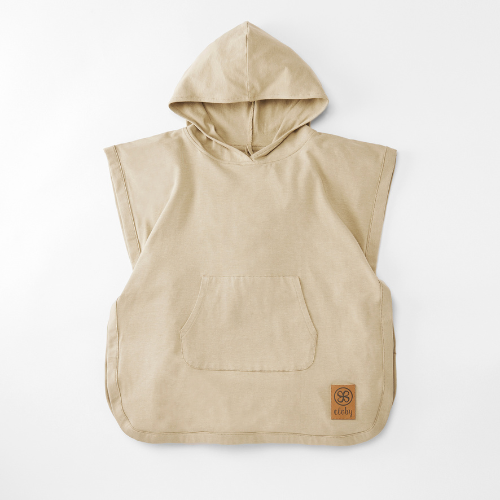 The poncho’s have a front pocket, hood and 2 snapbuttons under the arm to stay in place during playtime.