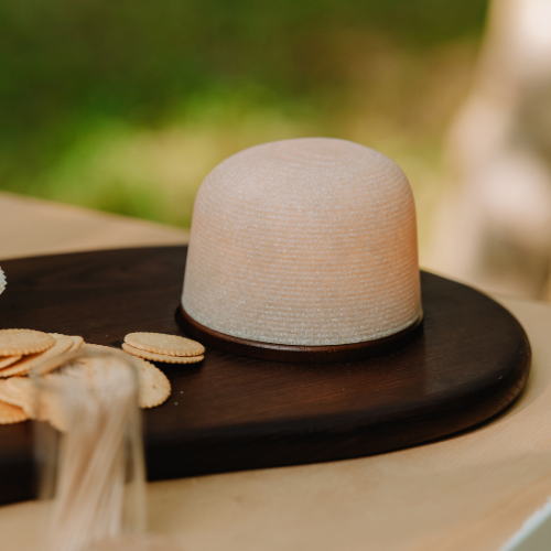 Die kleinen Fondant-Tischlampen sind auch einzeln erhältlich. Hergestellt aus 100% recyceltem Material und inspiriert vom „Melo Cake“, ein subtiler Hinweis auf die Patisserie-Wurzeln von Atelier Pierre.