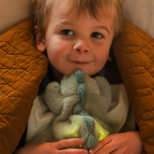 Durch ein leichtes Tippen auf den Tisch oder durch Drücken des Knopfs an der Unterseite kannst du die Helligkeit in 4 Stufen einstellen. So entscheidest du selbst, ob er die ganze Nacht über wacht oder sich nach 12 Minuten automatisch ausschaltet. Aktiviere den Schlafmodus, indem du den Ein-/Aus-Knopf 2 Sekunden lang gedrückt hältst. Das Licht dimmt sich dann sanft und erlischt schliesslich vollständig – ein weicher Übergang in die Dunkelheit, der dein Kind beruhigt, während es entspannt einschläft.