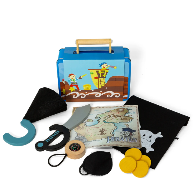 Der Koffer enthält: Augenklappe, Haken, Piratensäbel, Kompass, Schatzkarte, 4 Goldmünzen, Bandana
