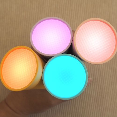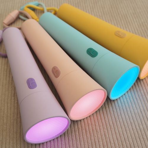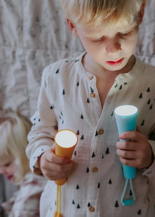 Die Taschenlampe strahlt Licht in zwei Farben aus: schlichtes Weiss und die gleiche Farbe wie die Aussenseite der Lampe. Extraspass für Kinder! Du kannst das Licht auch dimmen.